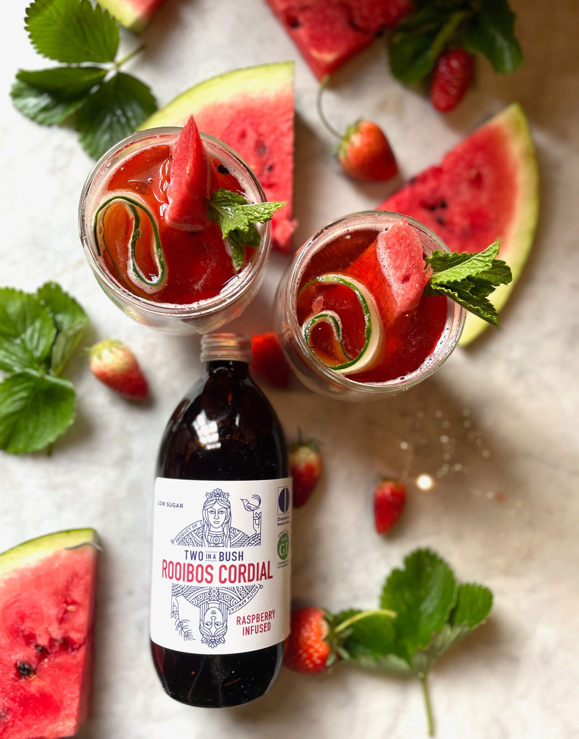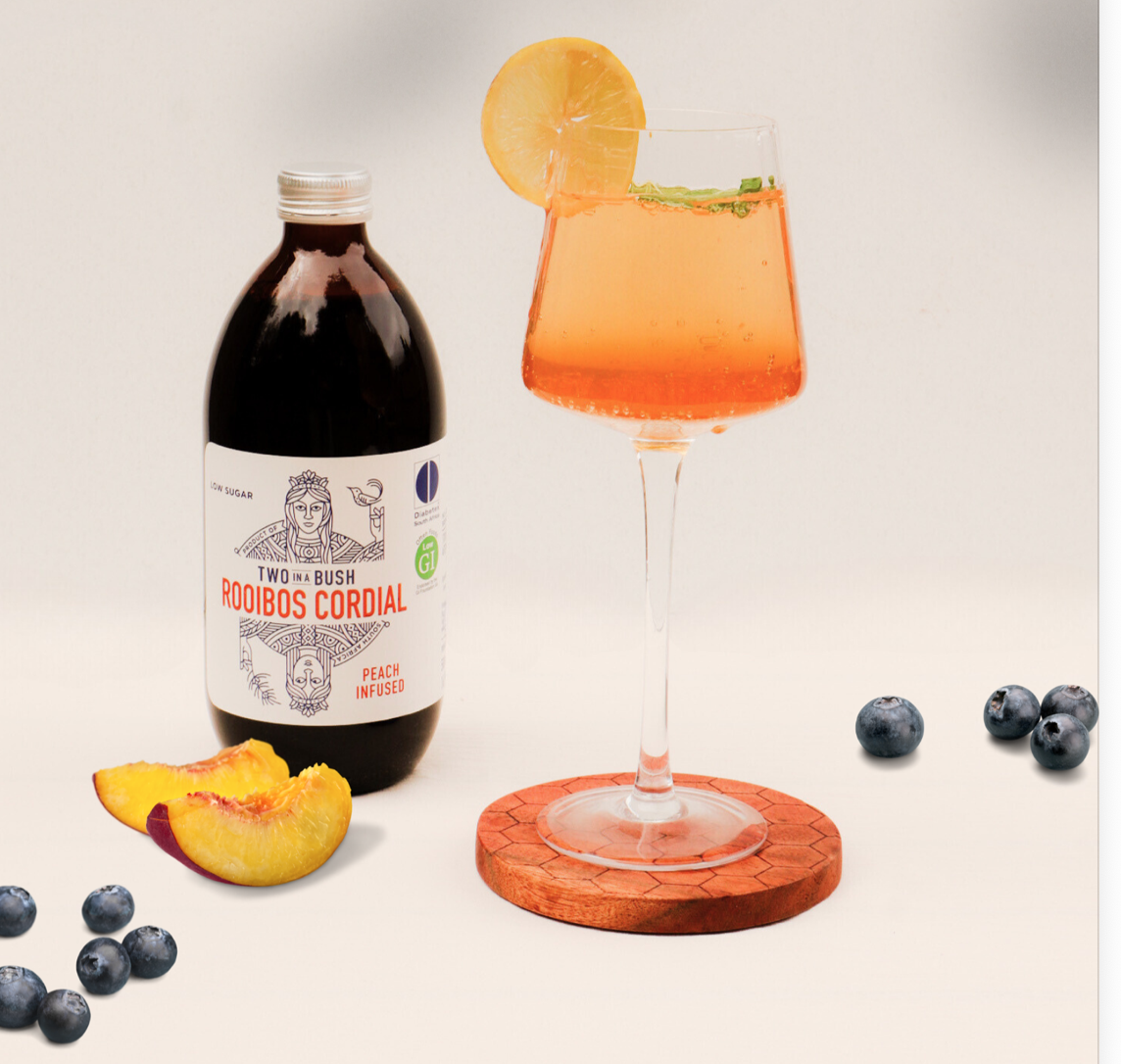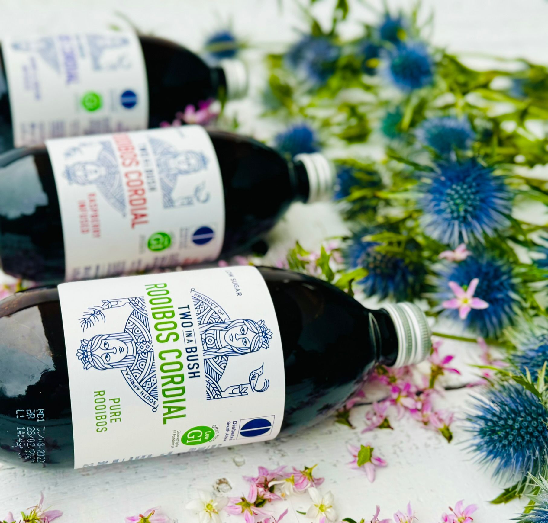 Premium Two in a Bush Rooibos Iced Tea Cordials are crafted from natural ingredients in the old-fashioned way with no preservatives or artificial additives and a low sugar content. Organic rooibos tea leaves are brewed with pure mineral water and blended with natural fruit and hand-picked botanicals to create a cordial that tastes good and is good for you.