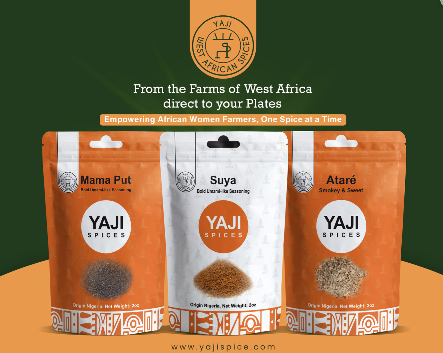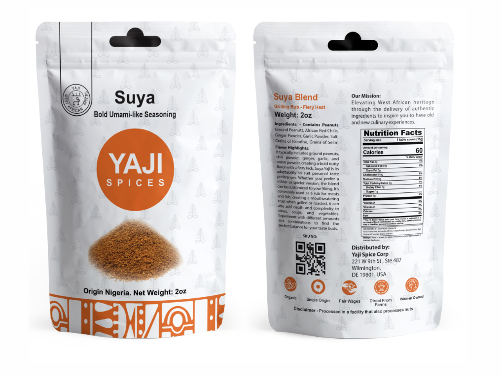 Yaji Spice brings you ethical direct from farm single spices and spice blends curated with 100% of our ingredients from Ripples in Africa, a co-op of over 11,000 women- run coop farms in Nigeria and Ghana. (Ripplesinafrica.org). Our blends of 8-12 spices freshly milled and blended during each production run to ensure you’re getting maximum potency and 100% flavor you can smell in every pouch. Zero additives, just Spice.